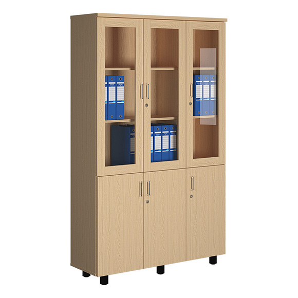 Quy cách: Tủ tài liệu 3 khoang chất liệu gỗ công nghiệp phủ melamine, bên trên gồm 3 khoang khung cánh kính có khóa, trong có 2 đợt di động.