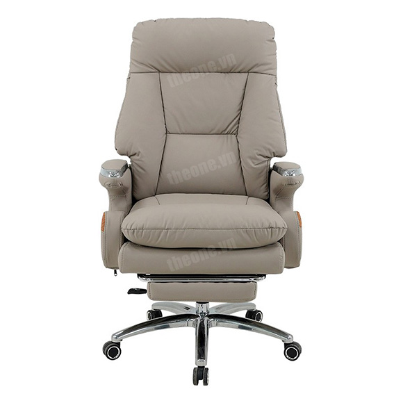Quy cách: khung cốt gỗ, đệm tựa được bọc bằng chất liệu giả da / Ghế có khả năng điều chỉnh độ cao và độ ngả có gác chân / Tay ghế được ốp mạ thẩm mỹ cao, tạo điểm nhấn sang trọng / Chân ghế bằng hợp kim nhôm.