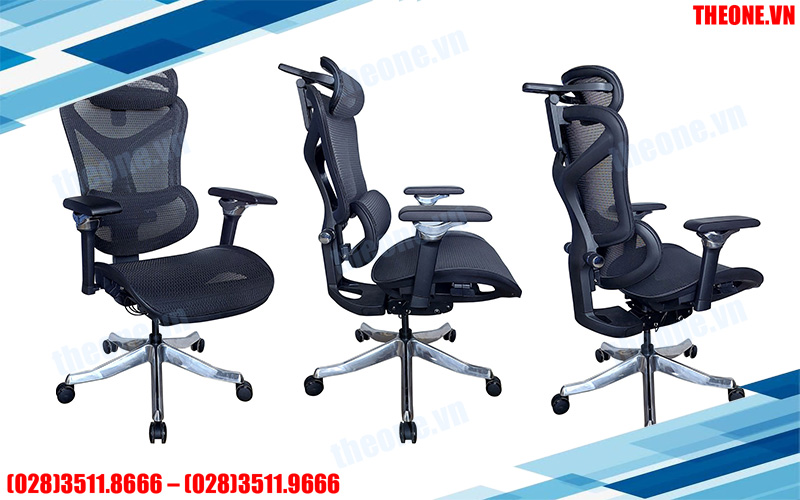 Quy cách: khung nhựa bọc vải lưới, tựa tăng chỉnh có thể ngả hãm, eo có thể tùy chỉnh. Tay ghế 5D mặt PU, tựa đầu 4D. Chân hợp kim nhôm.