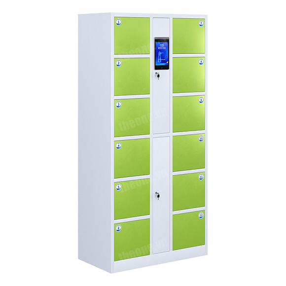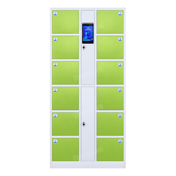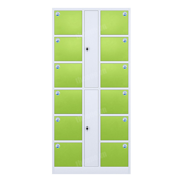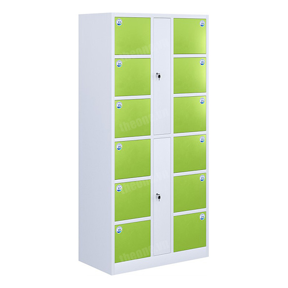 Quy cách: Tủ sắt 12 ngăn để đồ và khoang kỹ thuật ở giữa.